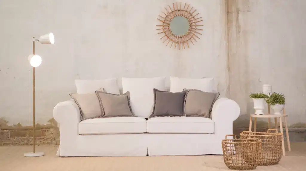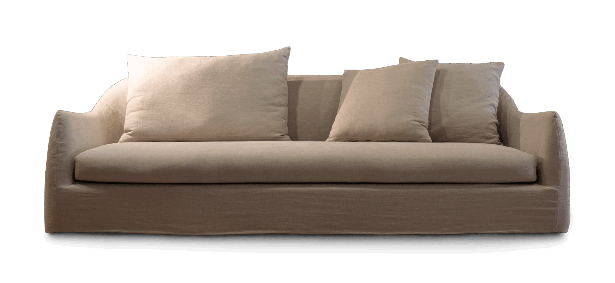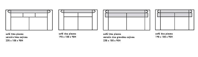 Almohadones de respaldo rellenos: versión tres cojines respaldo, en pluma de oca esterilizada; y versión dos cojines respaldo, en fibra hueca 100% pol. siliconada